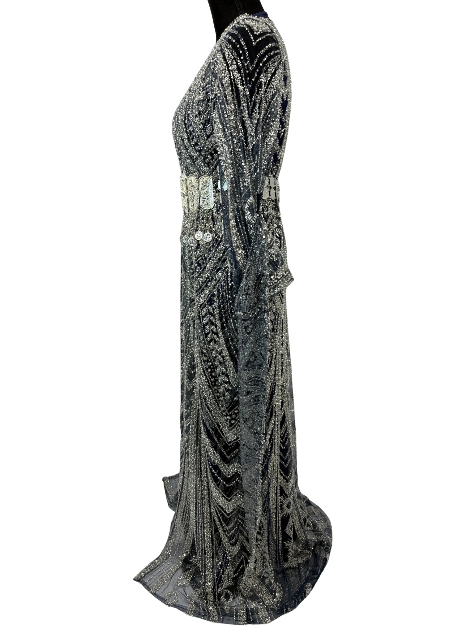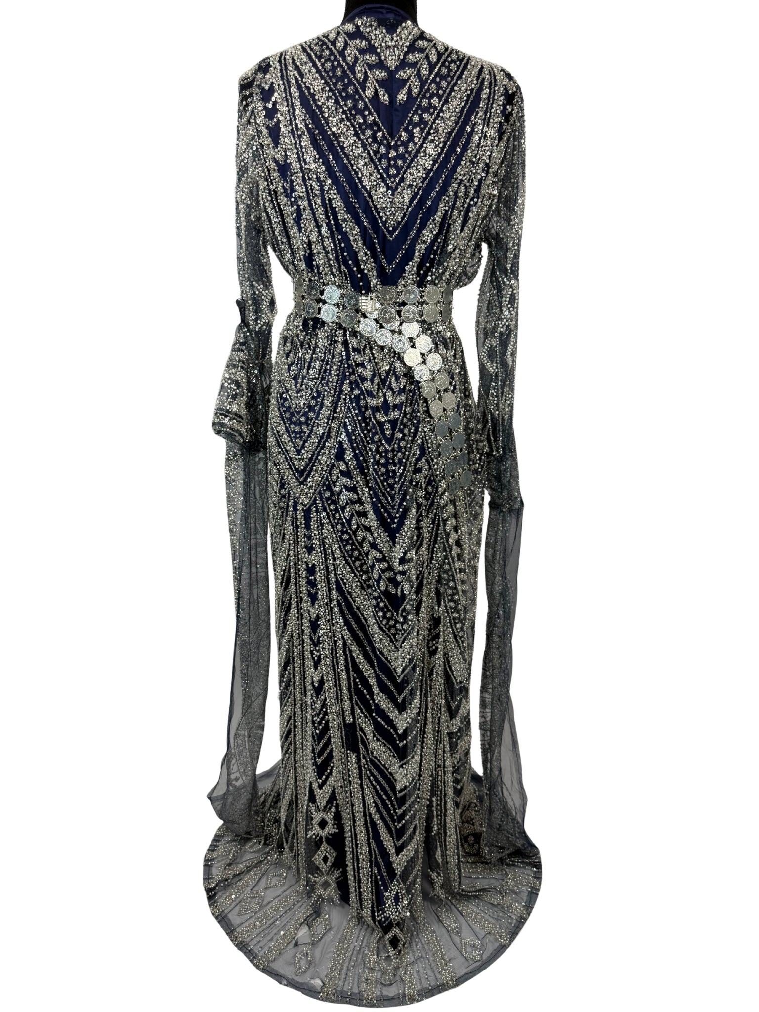 Jilenpiroz Sedef donkerblauwe Koerdische jurk met parelwitte kralen – voorkant