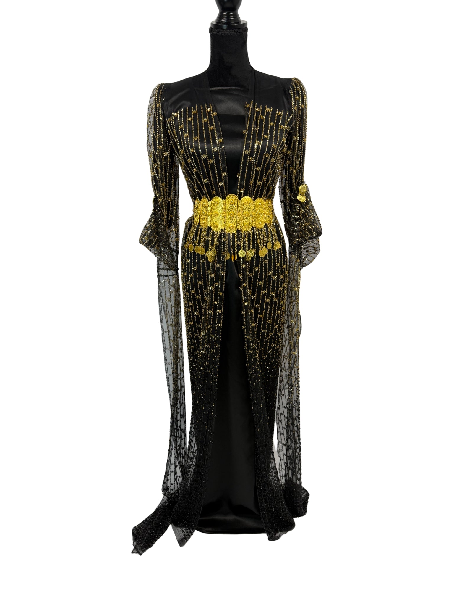 Jilenpiroz Zeri Res zwarte Koerdische feestjurk met goud kralenwerk en satijnen binnenjurk – voorkant