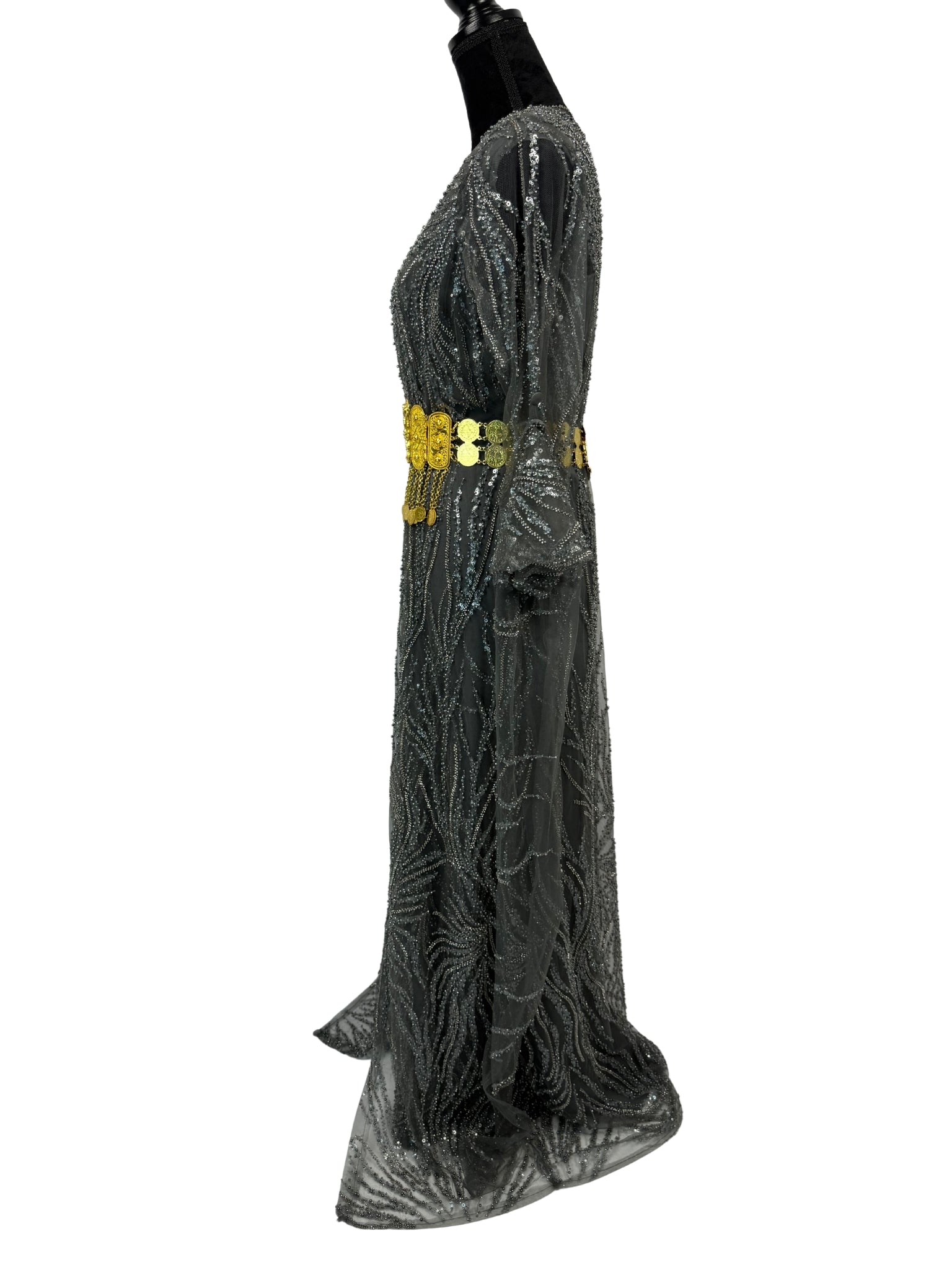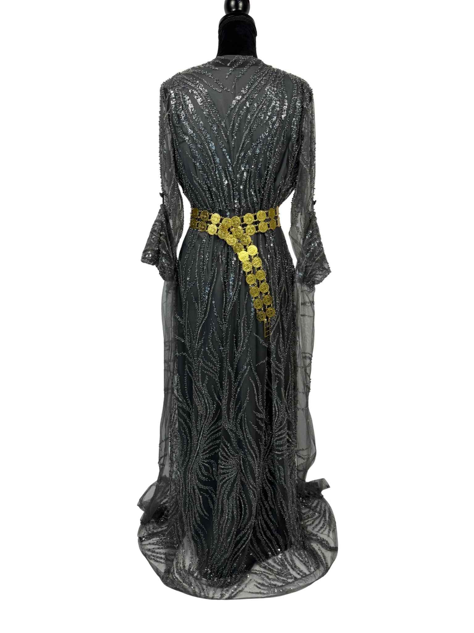 Jilenpiroz Kevir donkergrijze Koerdische feestjurk met kralen – voorkant