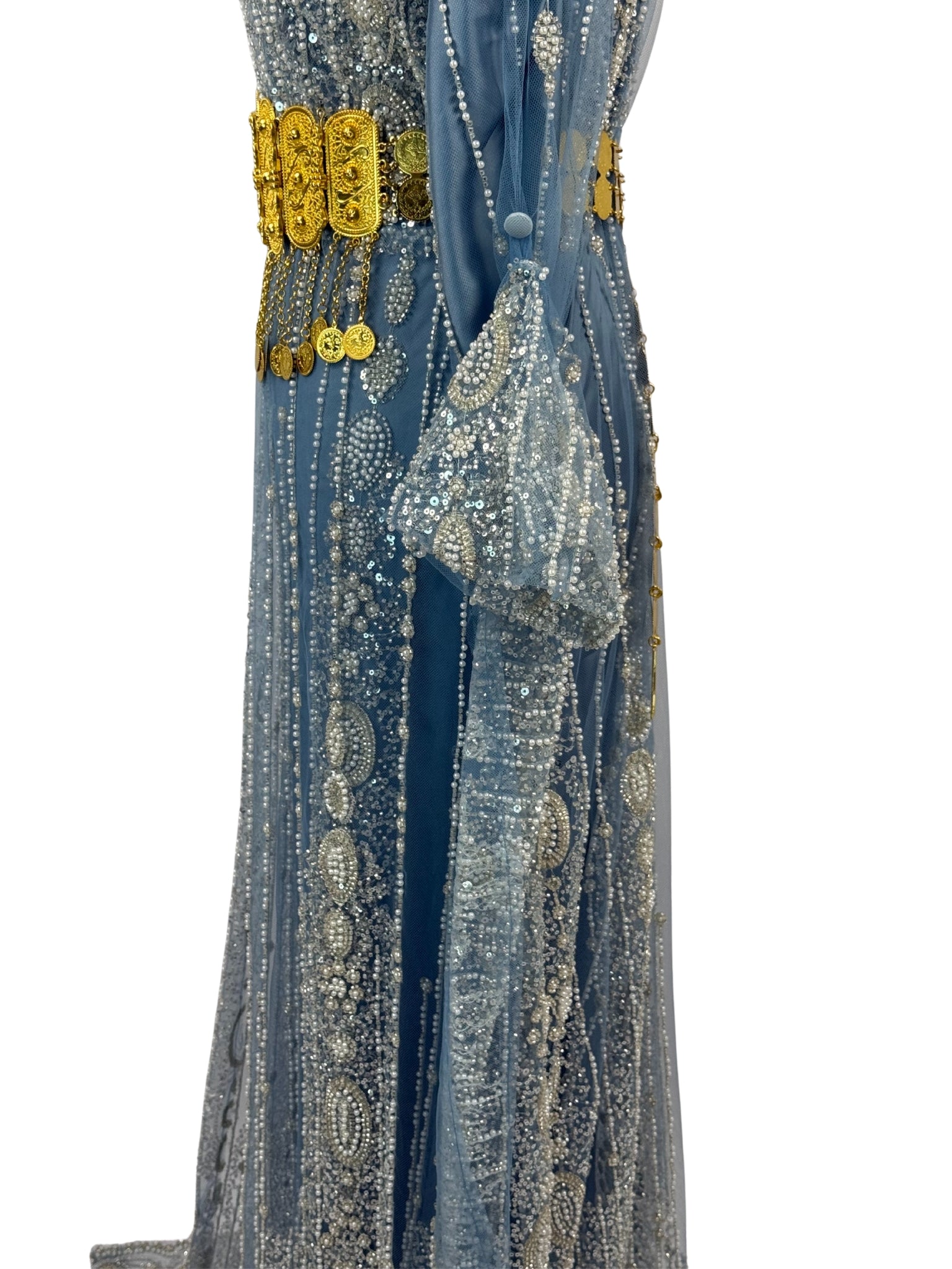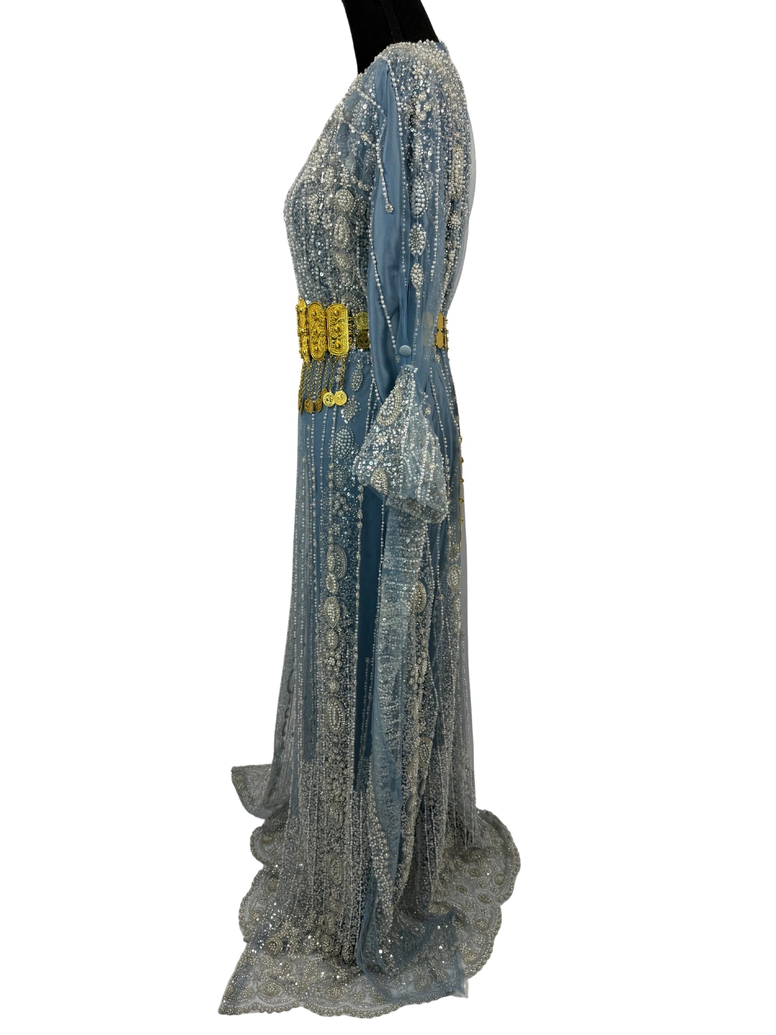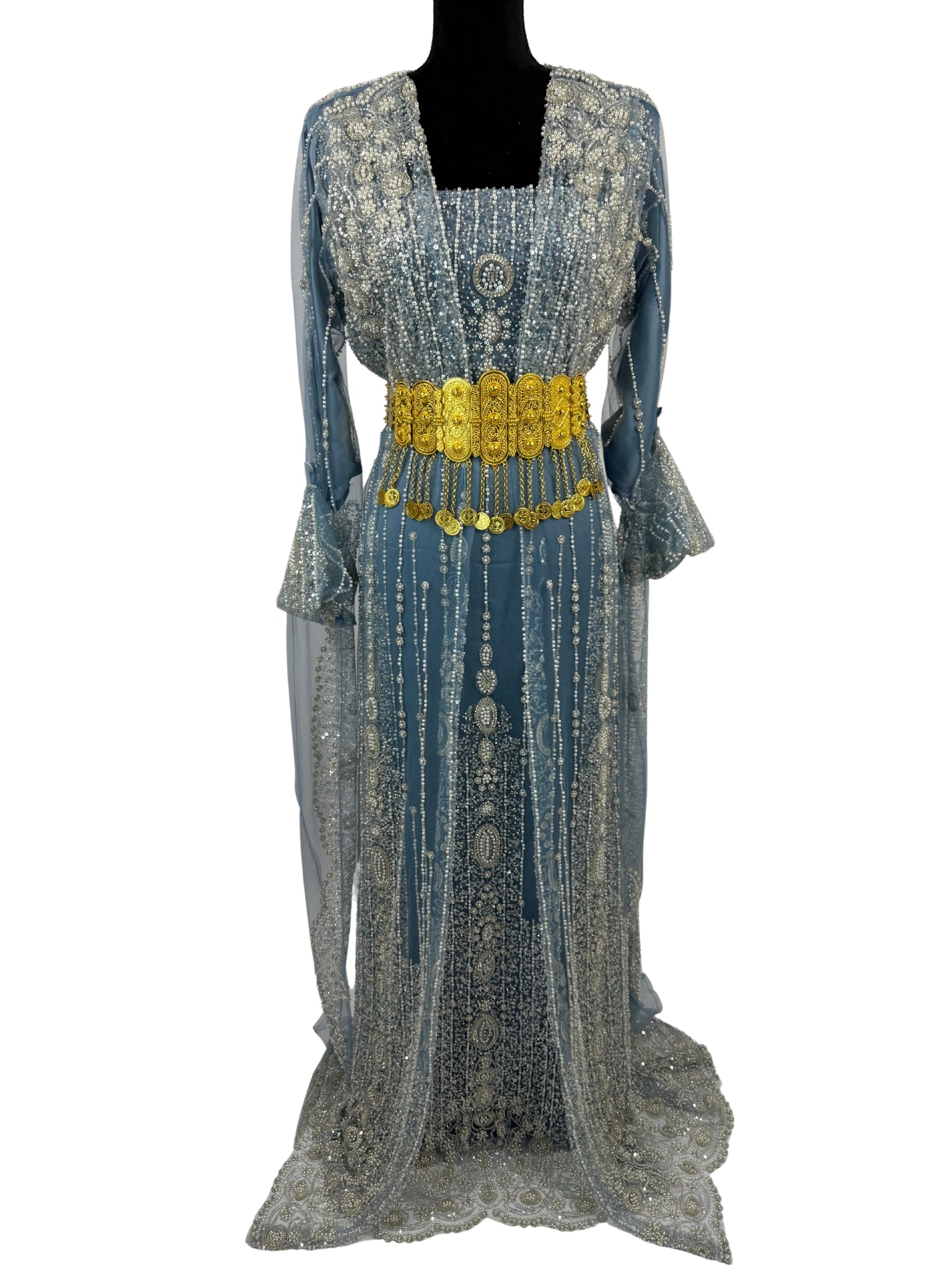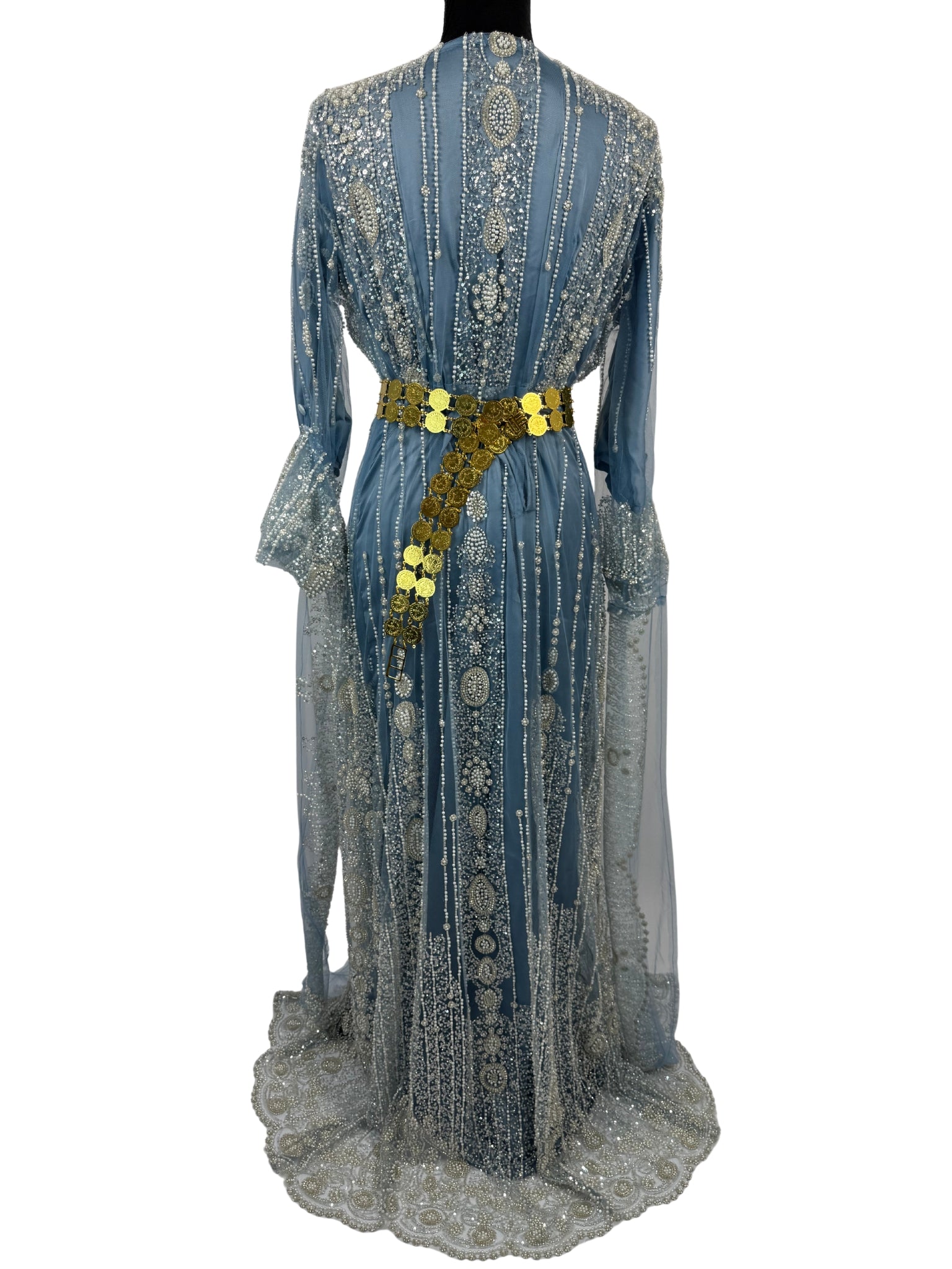 Jilenpiroz Ava ijsblauwe Koerdische jurk met zilverkralen en gouden riem – voorkant
