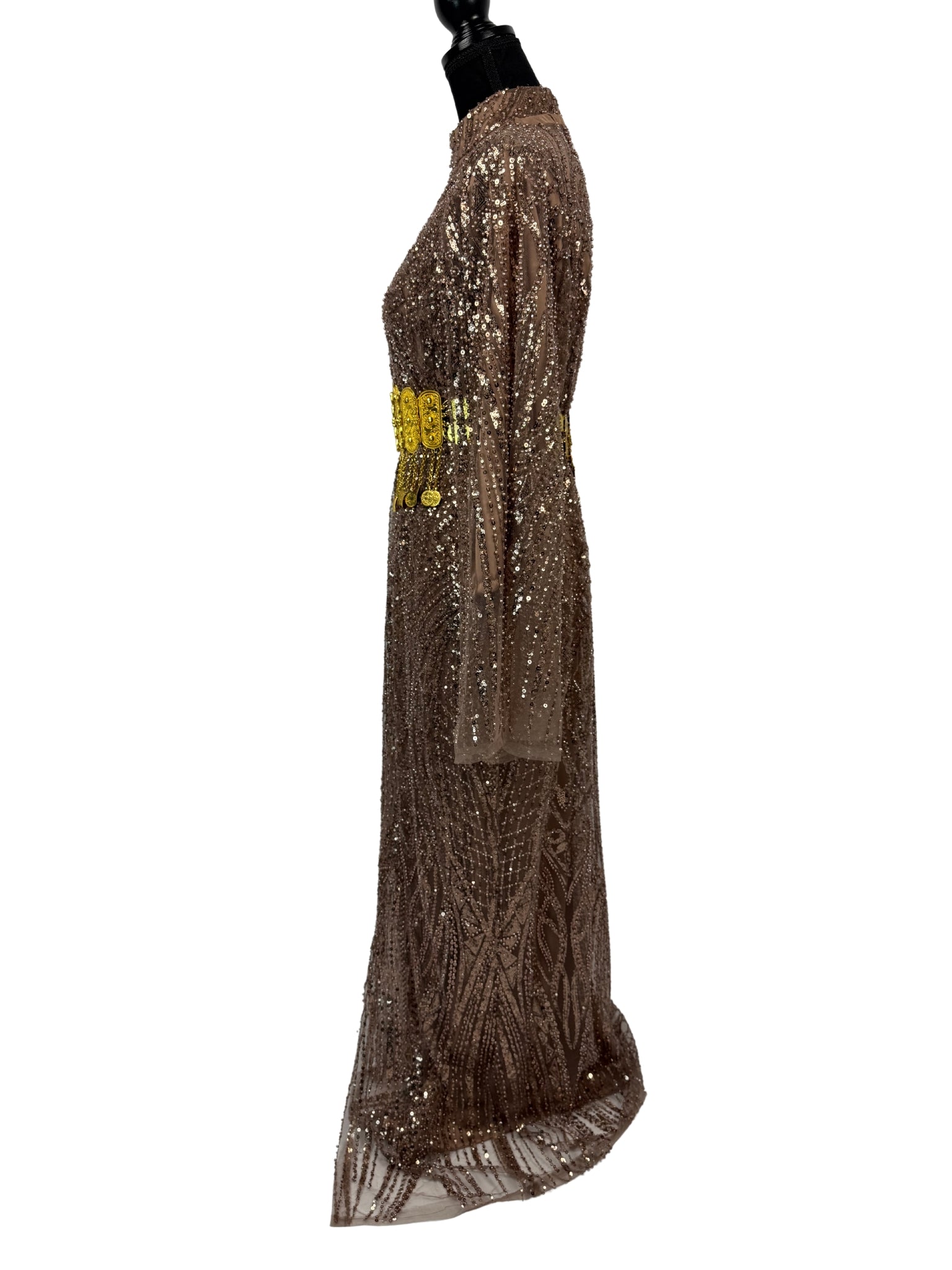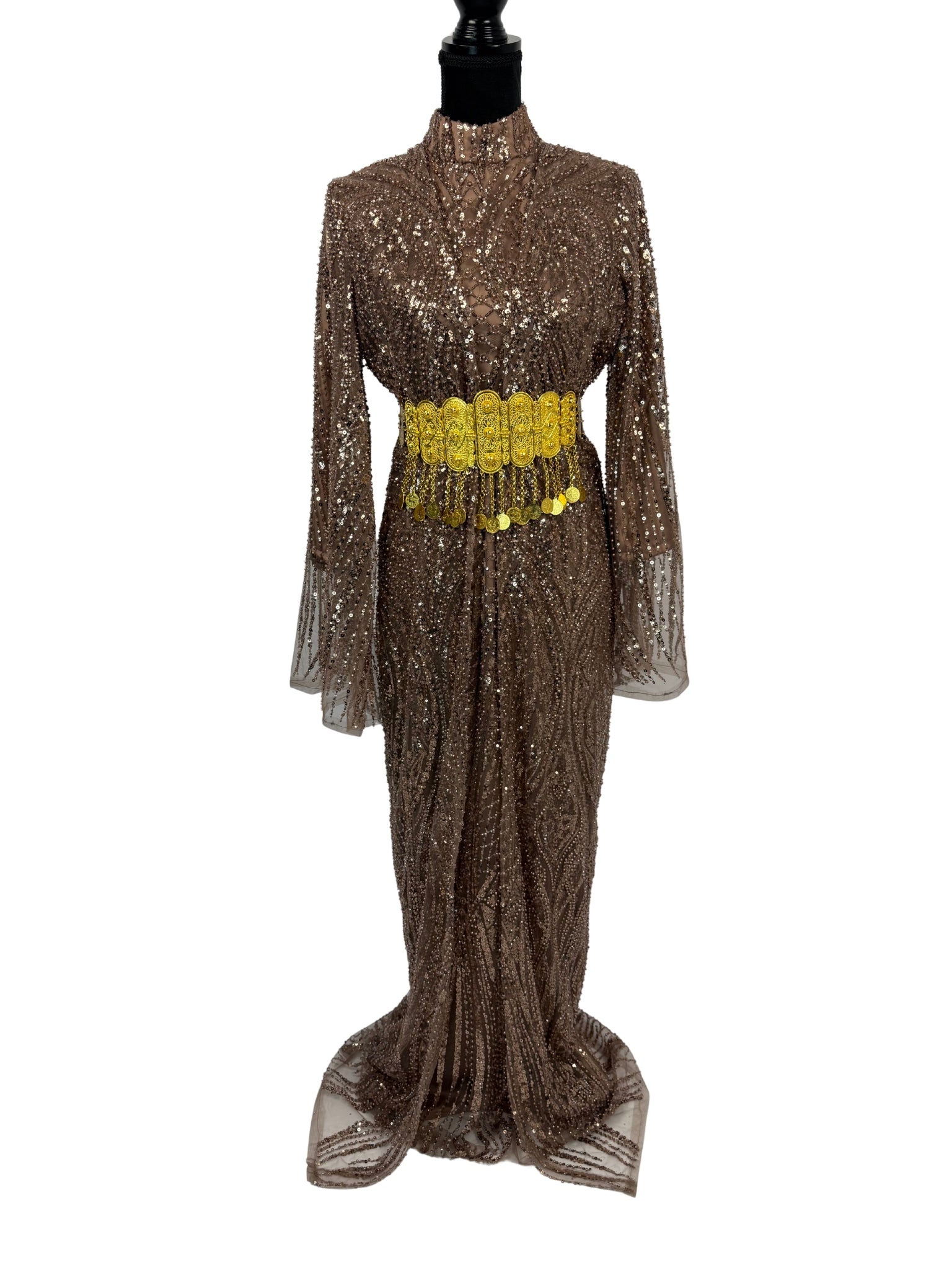 De Jilenpiroz Zemin is een stijlvolle bruine Koerdische feestjurk met een luxe uitstraling. De jurk is rijk versierd met glinsterende kralen en pailletten, waardoor het patroon prachtig oplicht bij beweging en licht. Dankzij de hoge hals en lange, volledig bedekte mouwen straalt Zemin elegantie én een modest look uit — perfect voor wie chique én verfijnd wil verschijnen.