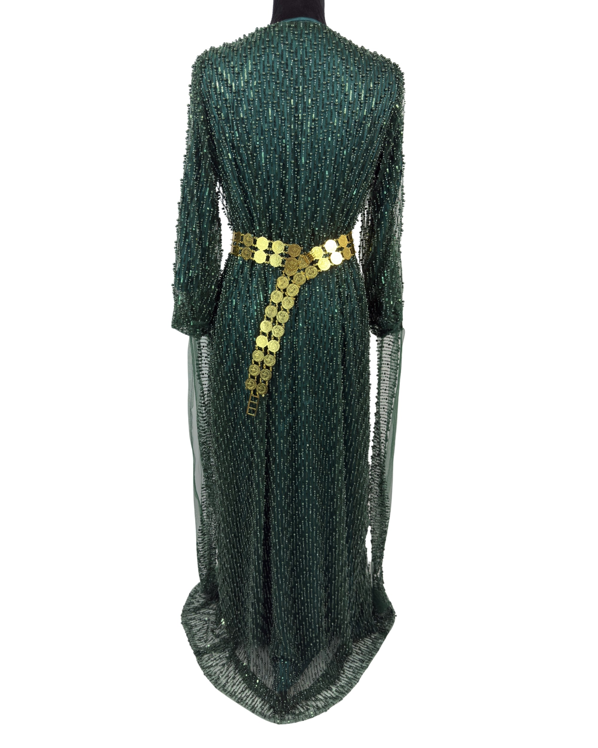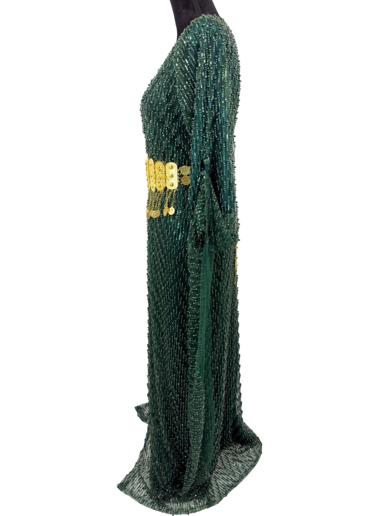 De Jilen Piroz Zozan is een luxe donkergroene Koerdische jurk met all-over kralenwerk dat prachtig schittert bij elke beweging. De elegante snit in combinatie met de gouden riem accentueert de taille en geeft een feestelijke, chique uitstraling. Perfect voor bruiloften, hennafeesten en speciale gelegenheden.