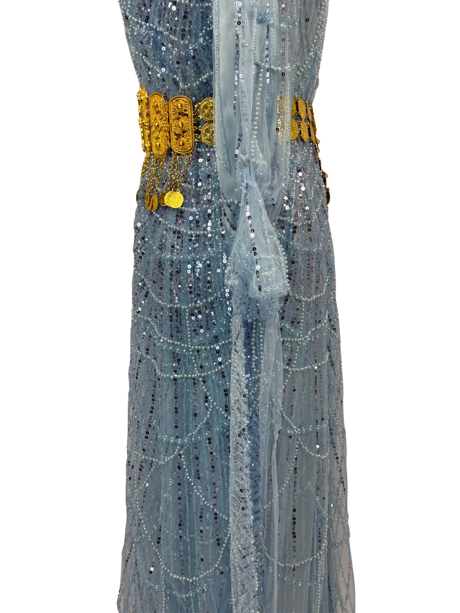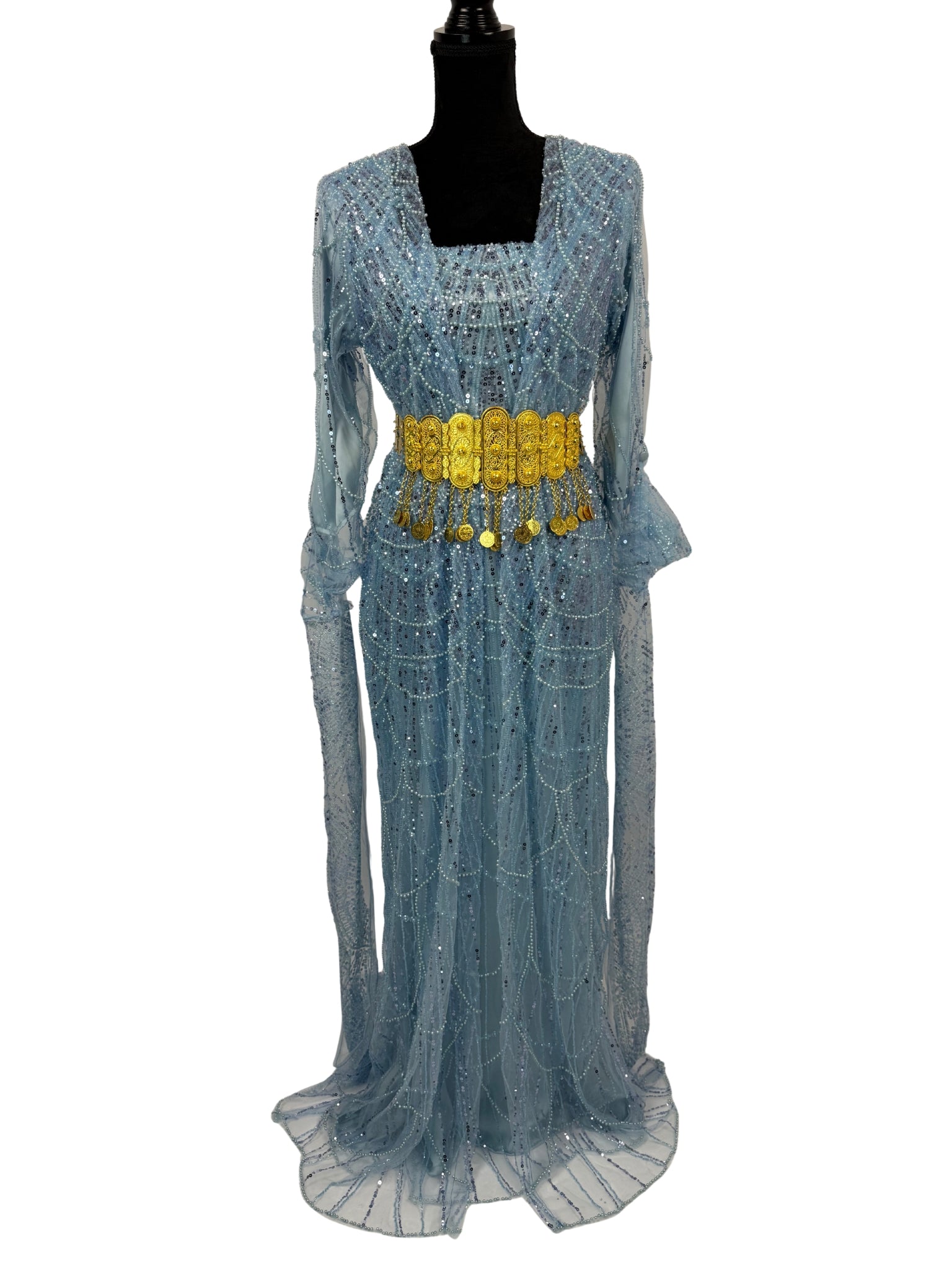 Jilenpiroz Okyanus is een oceaanblauwe Koerdische feestjurk met een luxe glans en verfijnde kraal- en paillettenlook. Het model heeft een elegante vierkante halslijn en rijke, golvende details over de hele jurk voor een chique, feestelijke uitstraling.