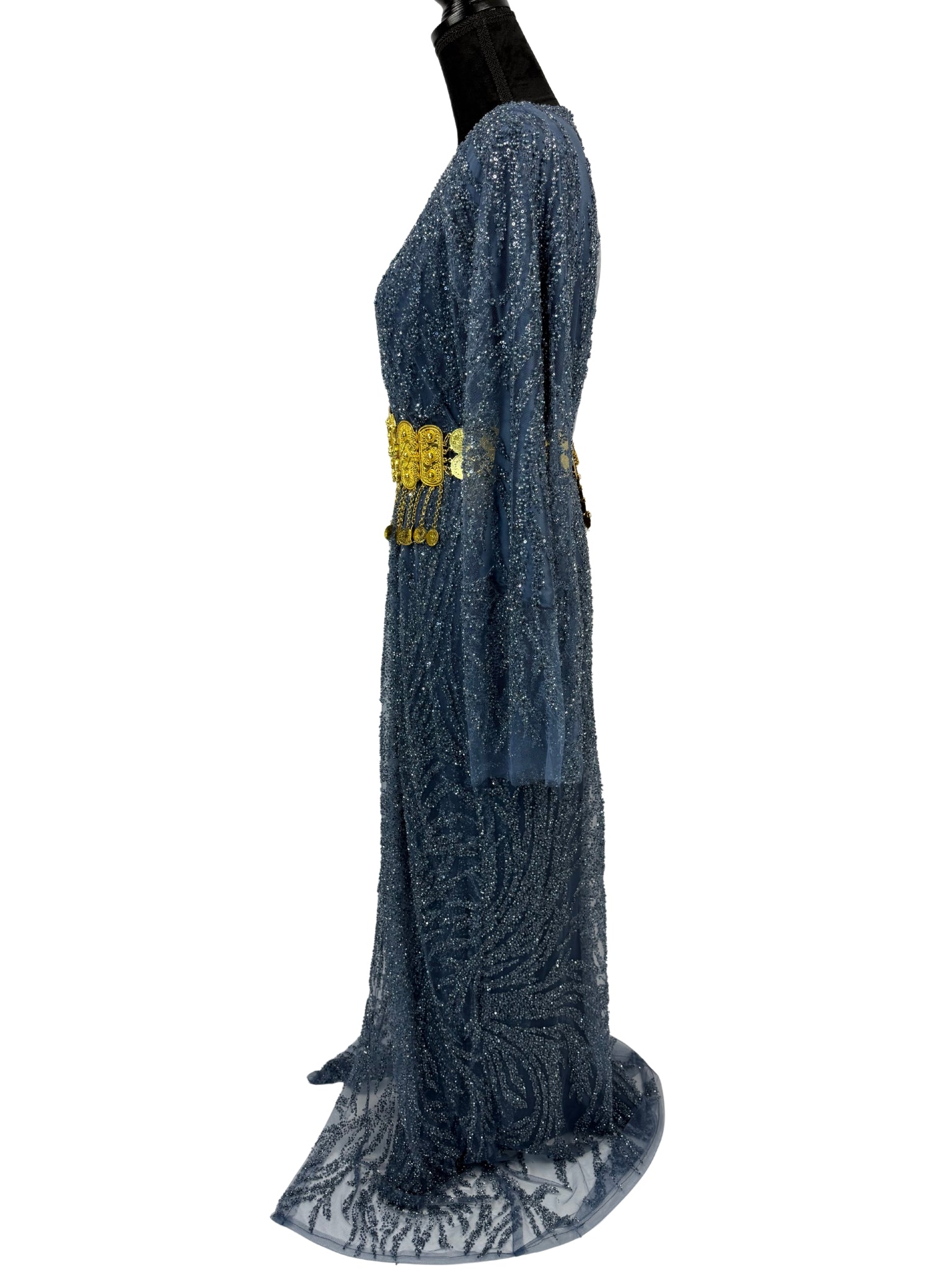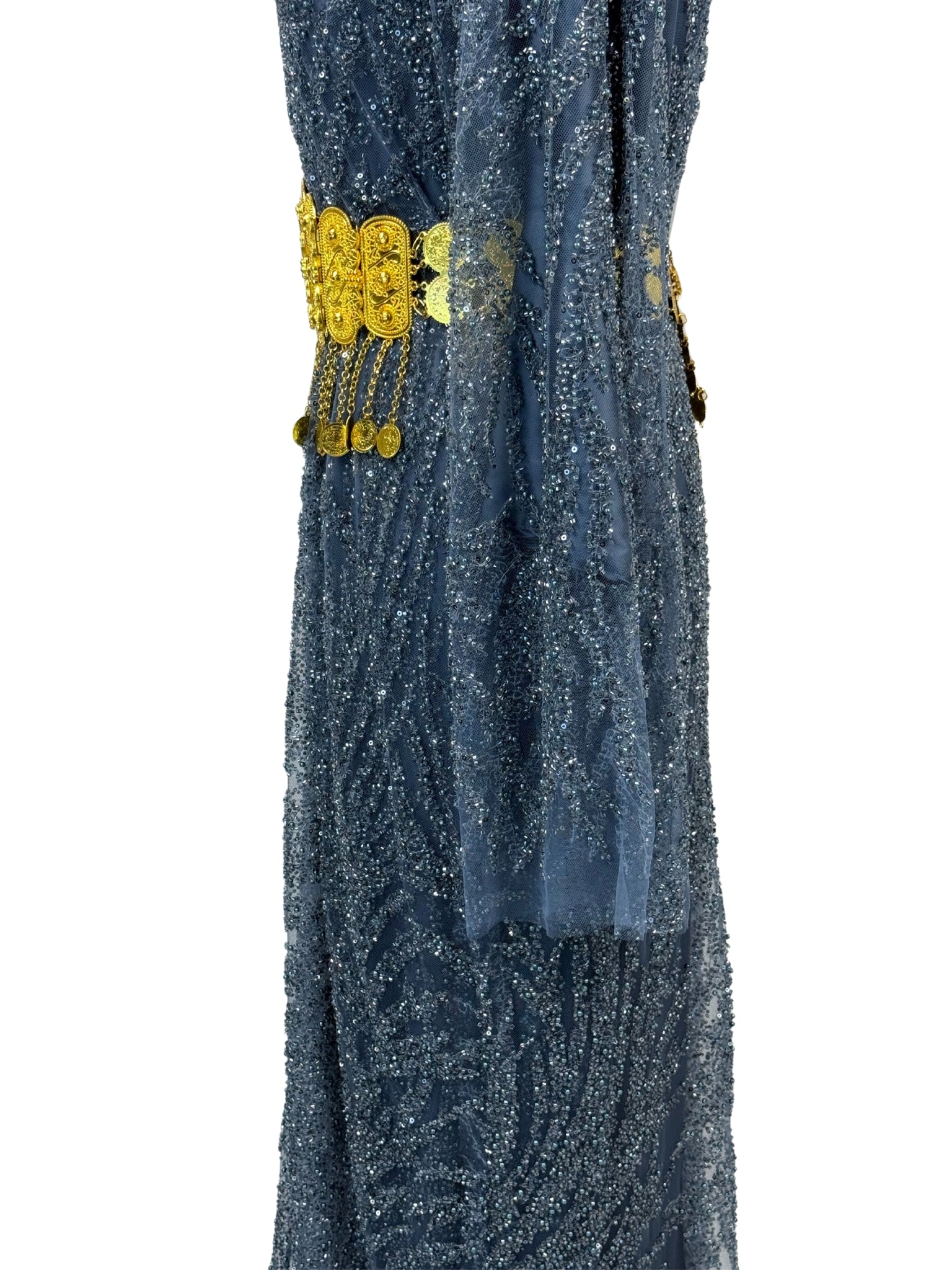 De Jilenpiroz Baran is een elegante donkerblauwe Koerdische jurk met een rijke, feestelijke uitstraling. De stof is verfijnd afgewerkt met glinsterende kralen en een subtiel patroon dat prachtig tot zijn recht komt bij avondlicht en op foto’s. De jurk valt lang en sierlijk, waardoor je direct een luxe look krijgt.