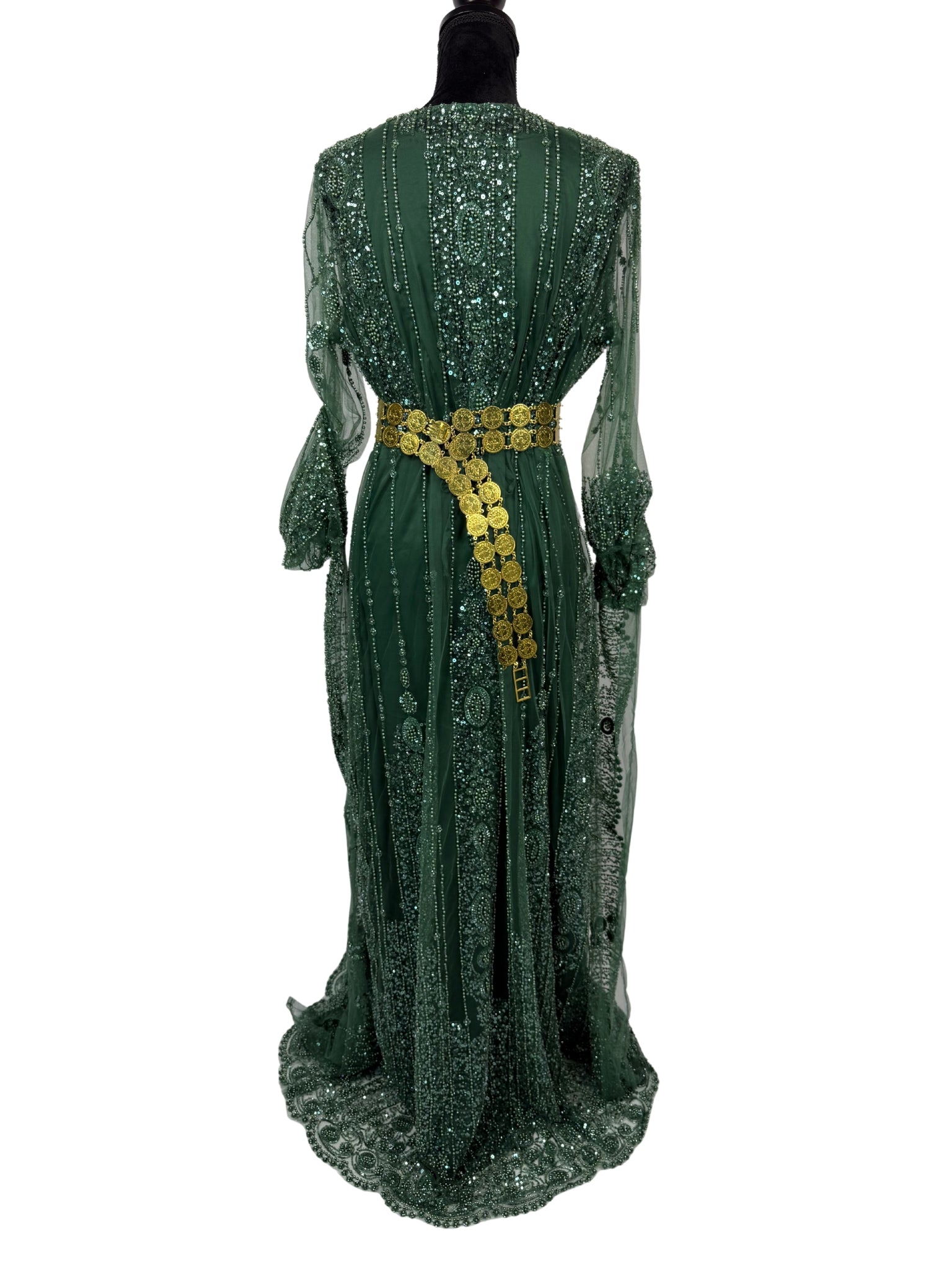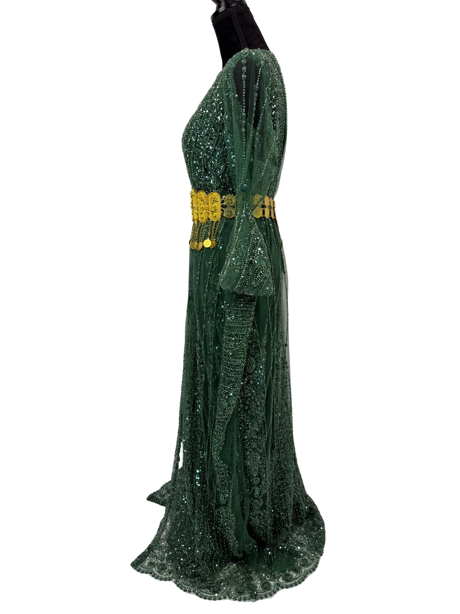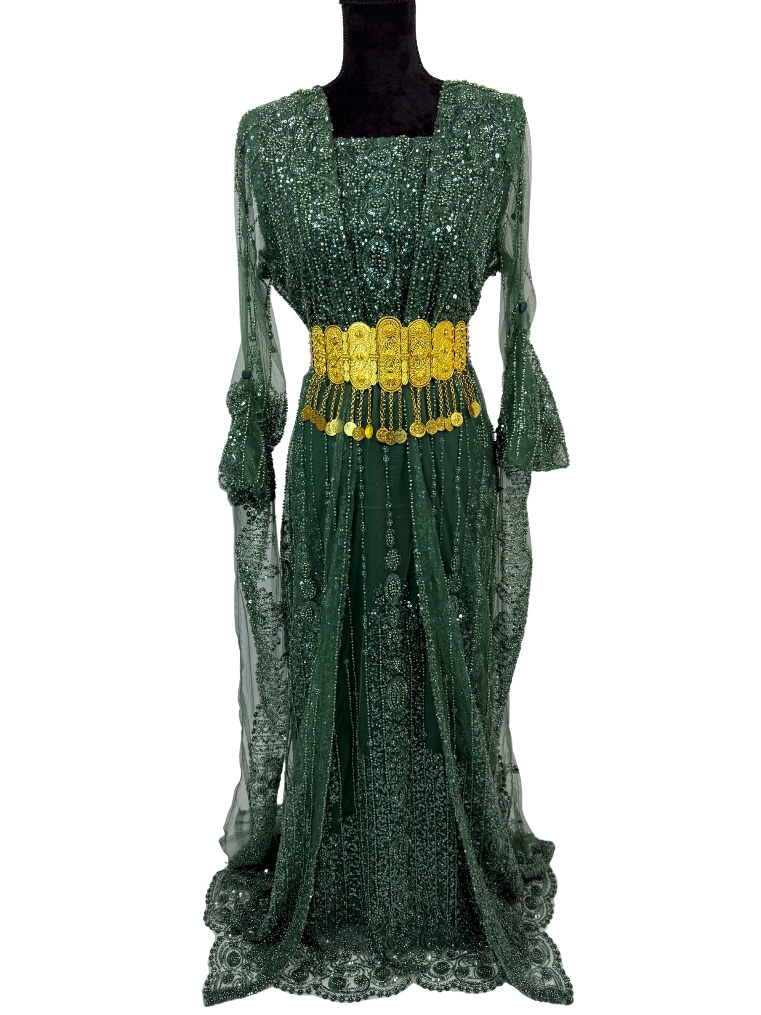 Jilenpiroz Kesk Jihan groene Koerdische jurk met kralen en gouden riem – voorkant