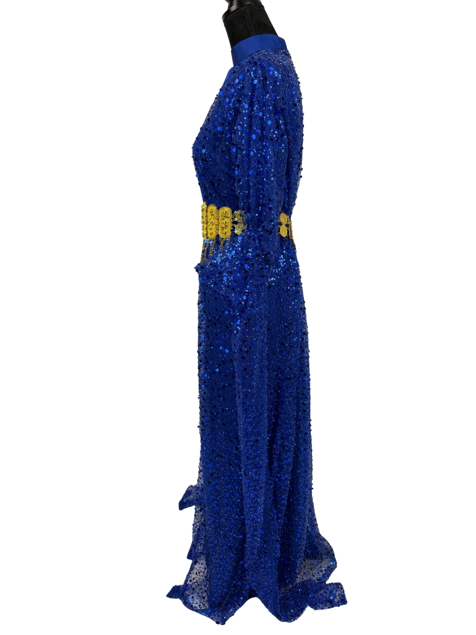 Jilenpiroz Lazur is een opvallende Koerdische feestjurk in een diepe lazur-/koningsblauwe tint, rijk afgewerkt met glinsterende pailletten over een elegante, soepel vallende basis. De jurk heeft een chique open-front look met een mooie V-lijn en lange, sierlijke mouwen met extra vallende details voor een luxe “statement” effect bij elke beweging.